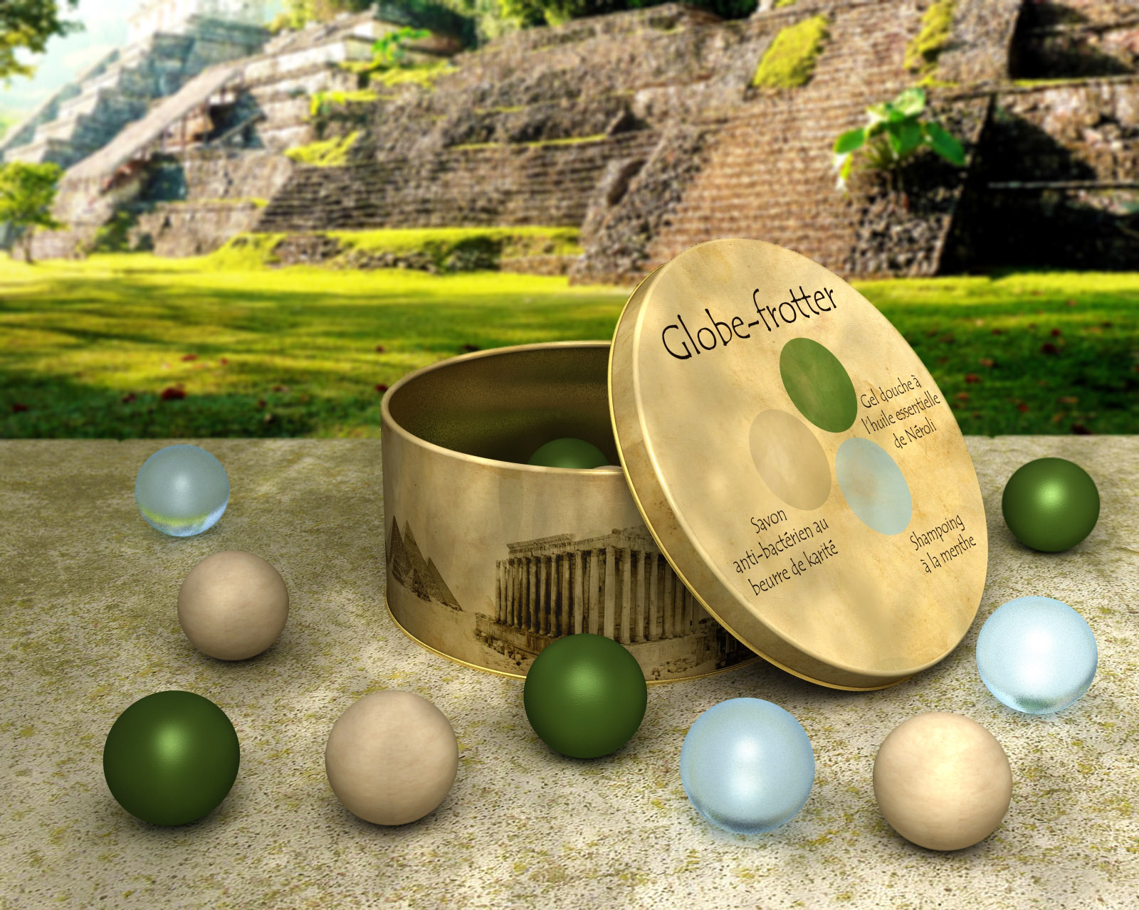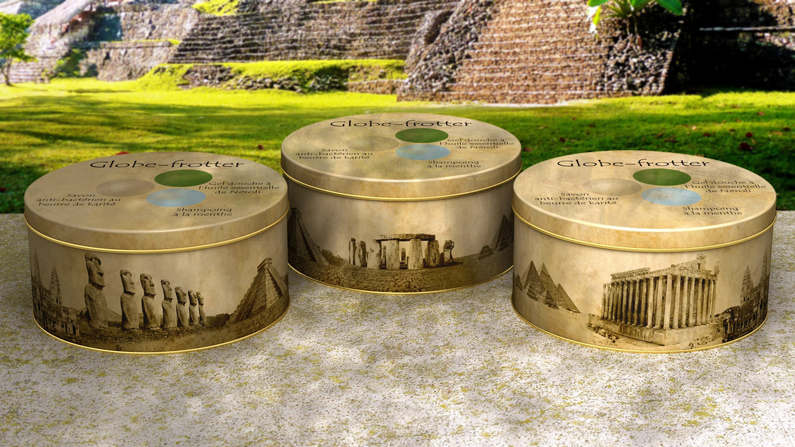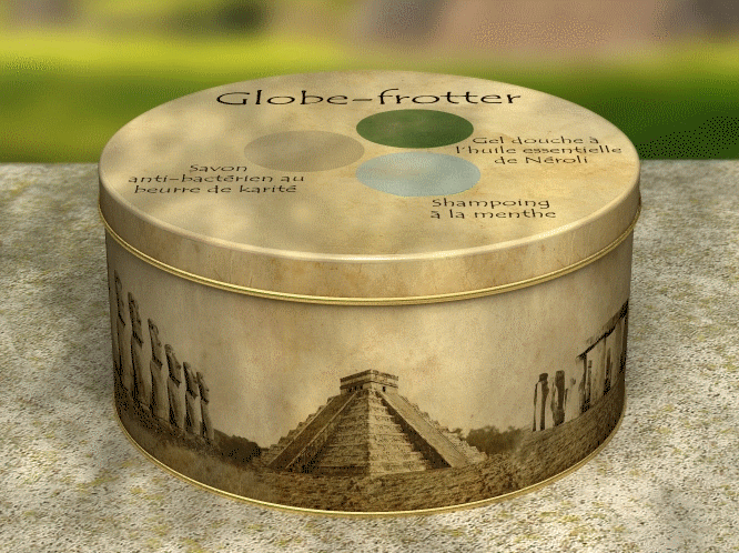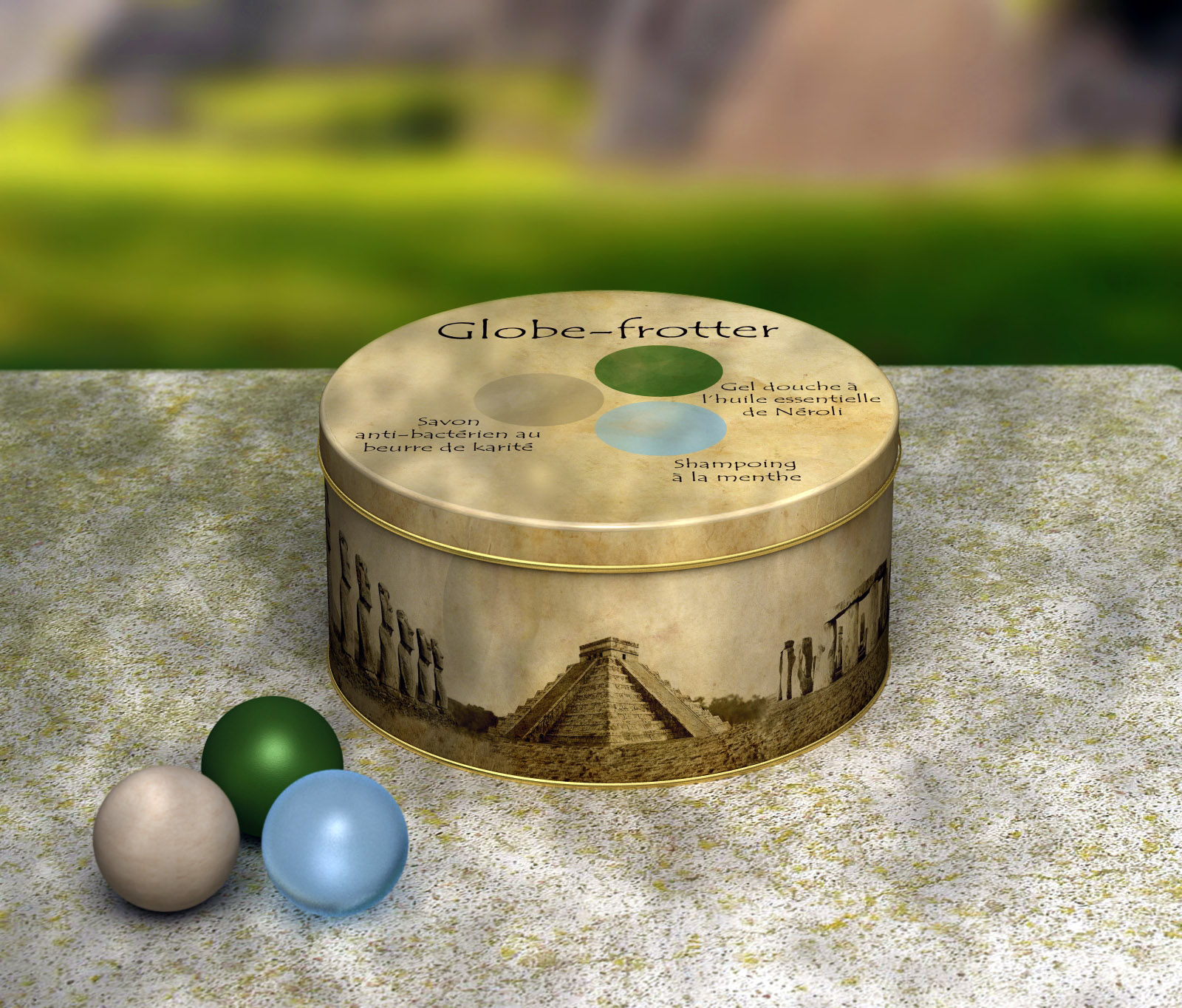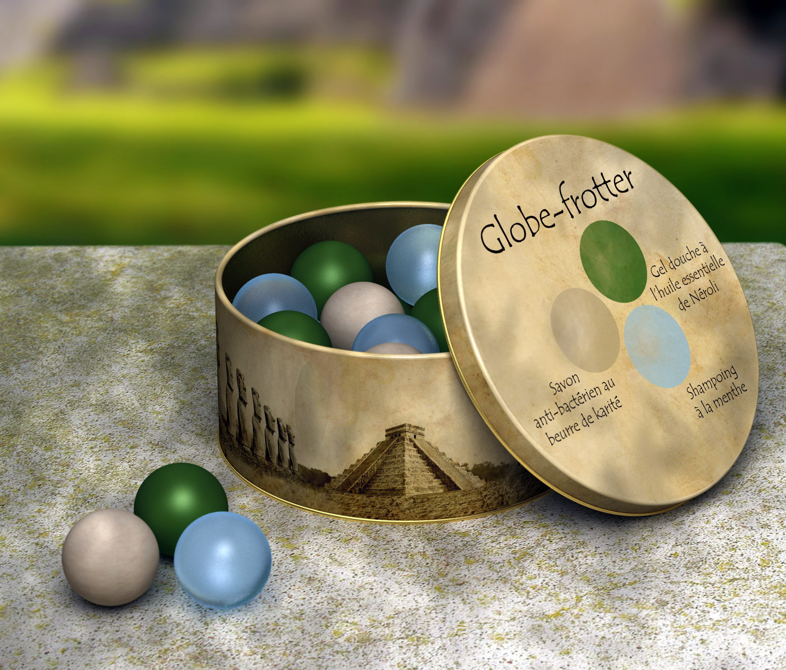 Boîte de cosmétiques pour le voyage, créée en 2012, permettant de transporter gel douche et shampoing solides, devenus à la mode depuis. Un exercice d'entraînement pour les textures et les rendus : métal brossé, contour de la boîte où s'enchainent différents monuments, profondeur de champ, rendu animé, ...